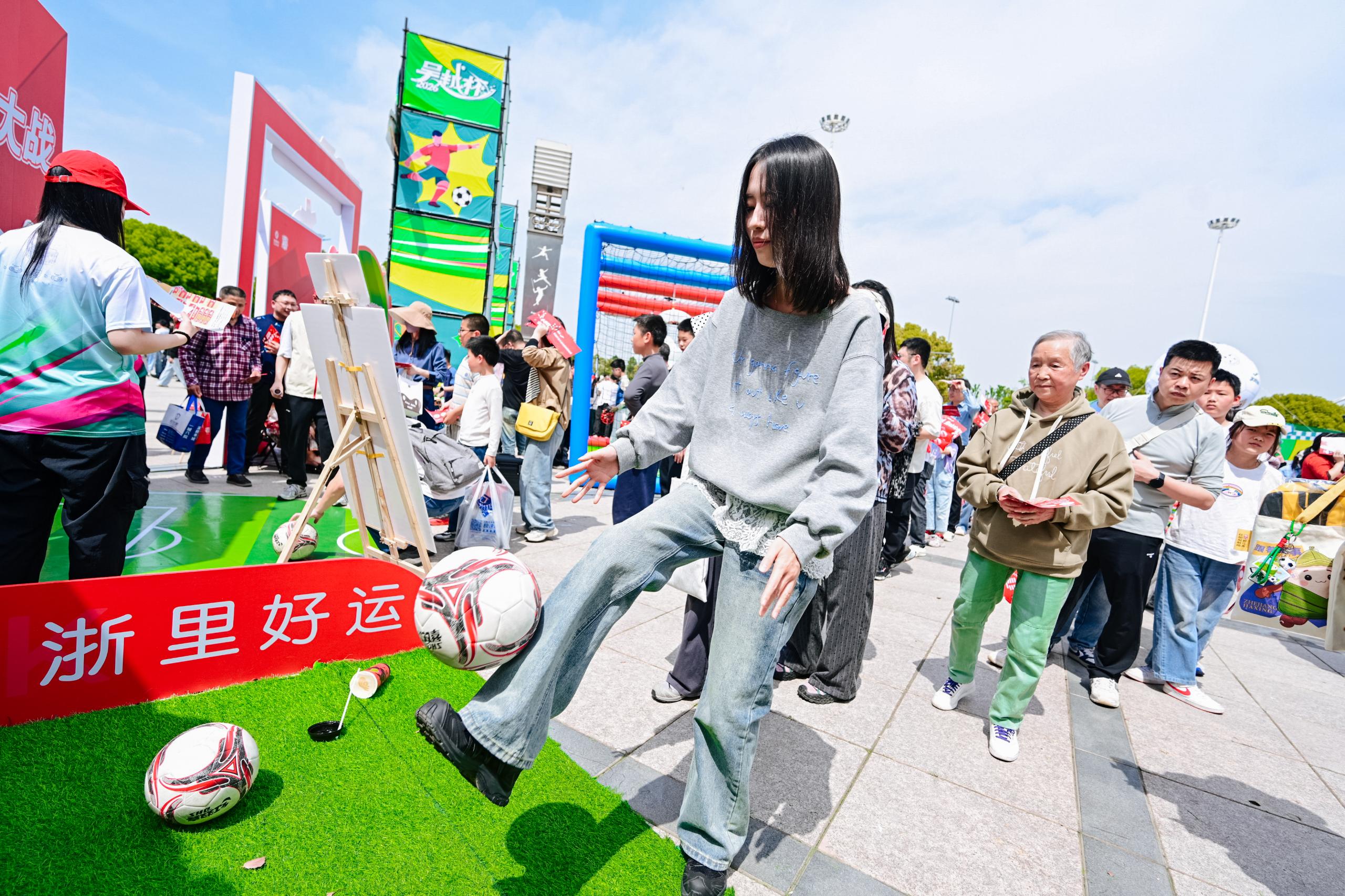值得一提的是,浙商银行为此次赛事打造的“全民嘉年华”活动成为人气焦点之一。活动现场举办了浙商银行手机银行“吴越杯”专区上线发布仪式,并在赛场外设立了超100平方米的沉浸式互动展区,包含主舞台直播、游戏打卡、非遗文创、市集美食等区域。主舞台直播区从文旅推介、美食体验等方面为观众提供独家“观赛旅行攻略”,并为外地球迷举办文旅联名信用卡授卡仪式,其赠送的文旅惠民卡权益覆盖省内及长三角120余个景区。游戏打卡区,浙商银行设九宫格点球大战、颠球“不落地”擂台、金融知识问答等一系列集章互动游戏,游客凭集章即可抽奖获得纪念好礼。前来观赛的有本地亲子家庭、大学生观赛团,还有许多外地球迷。一名绍兴来的女士表示“因为爸爸是衢州人”,所以她今天来支持衢州队。来自杭州的马女士则是来支持嘉兴队的,“因为嘉兴粽子好吃”,她笑着说。