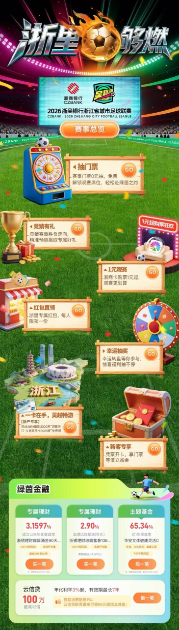 依托“浙里足够燃”专区,浙商银行打造了“绿茵金融”特色板块,整合理财子公司优质产品与云闪贷等信贷服务,将金融服务自然融入赛事场景,让球迷在观赛互动的同时,便捷获取专业金融服务。同时,专区还打通线上线下服务链路,用户可凭赛事票根在浙江省内浙商银行网点享受专属金融服务,实现线上互动与线下服务的深度联动。